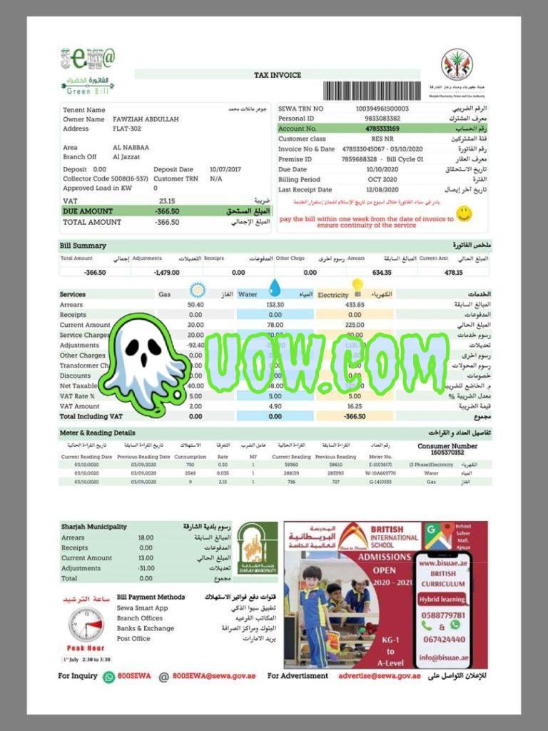 阿联酋税费账单(UAE Tax Bill)是由联邦税务局(Federal Tax Authority, FTA)或地方税务办公室生成的官方文件,用于记录增值税(VAT)、公司税或个人税费详情。该账单适用于企业交易、个人所得税申报或作为地址证明(Proof of Address),符合阿联酋税务法规(VAT Law No. 8 of 2017)。以下是通用VAT发票模板,可修改为公司税或个人税费账单,用于地址验证或税务记录。