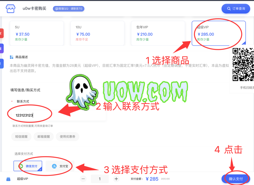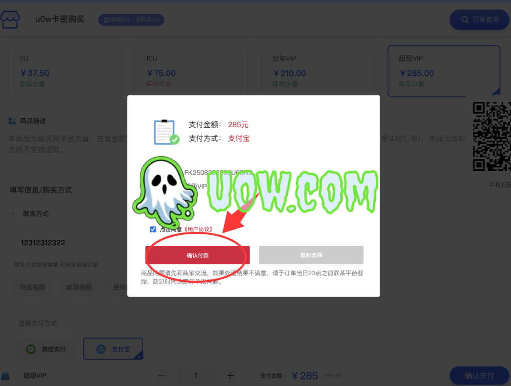 二,选择商品,输入联系方式,点击确认支付。