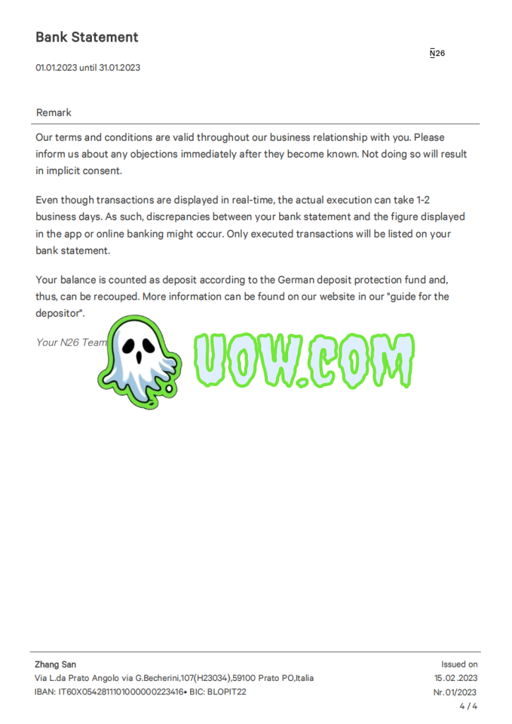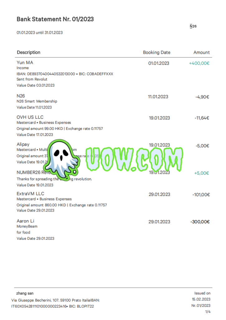 账单总结了张三2023年1月1日至31日的账户活动情况。对账单显示,期间共存入400欧元和410欧元,向N26、OVH US LLC、支付宝和ExtraVM LLC提款共计422.54欧元。其他交易包括一笔5欧元的推荐奖金和向Aaron Li转账。在报告期间,账户总余额从511欧元增加到903.46欧元。