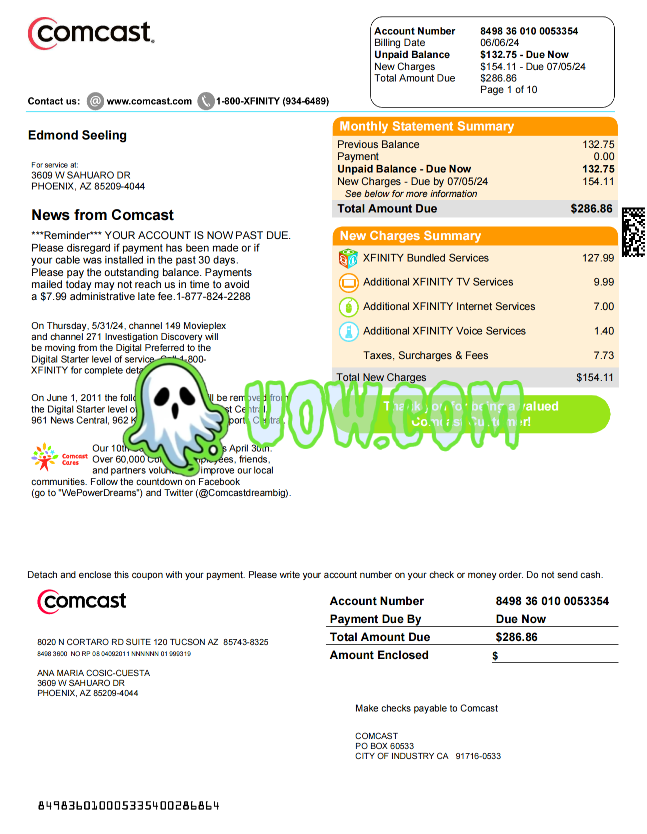 亚利桑那州 Cocast 账单是由 Comcast(Xfinity品牌,常见拼写为Comcast)为亚利桑那州客户提供的宽带、有线电视和电话服务月度账单。Comcast 是美国最大电信运营商,在亚利桑那州覆盖凤凰城、图森、斯科茨代尔等地,提供高速互联网、Xfinity TV 和语音服务。
