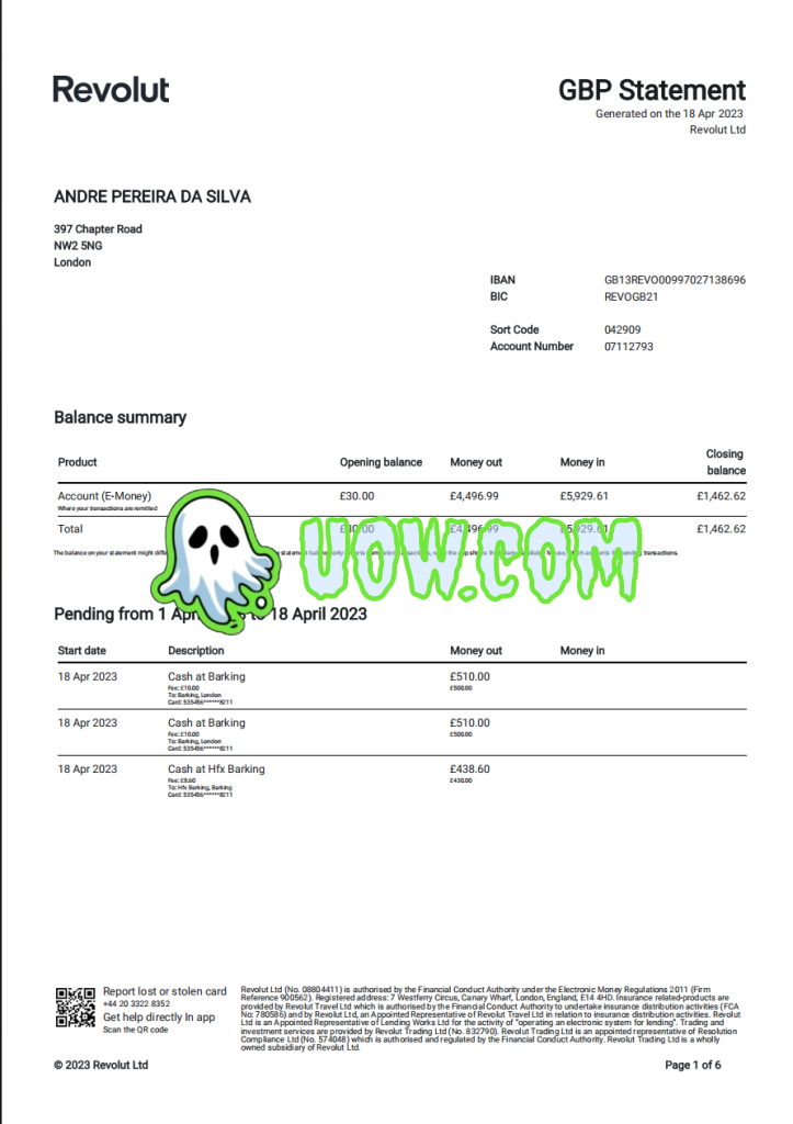 账单明细是安德烈·佩雷拉·达席尔瓦(Andre Pereira Da Silva)2023年4月1日至2023年4月18日期间的银行对账单。对账单列出了期初余额、期末余额、交易记录、待处理交易以及账户详细信息。在报告期间,账户支出4,496.99英镑,收入5,929.61英镑,因此期初余额为30英镑,期末余额为1,462.62英镑。此外,还有三笔待处理的现金取款,总计1,458.60英镑。请您根据自己的实际场景修改。