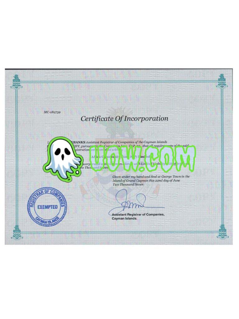 开曼群岛公司成立证书(Certificate of Incorporation)是由开曼群岛注册处(Cayman Islands General Registry)颁发的官方文件,证明一家公司在开曼群岛依法注册成立,成为合法的法人实体。该证书是公司合法存在的重要凭证,广泛用于国际商务和金融领域。