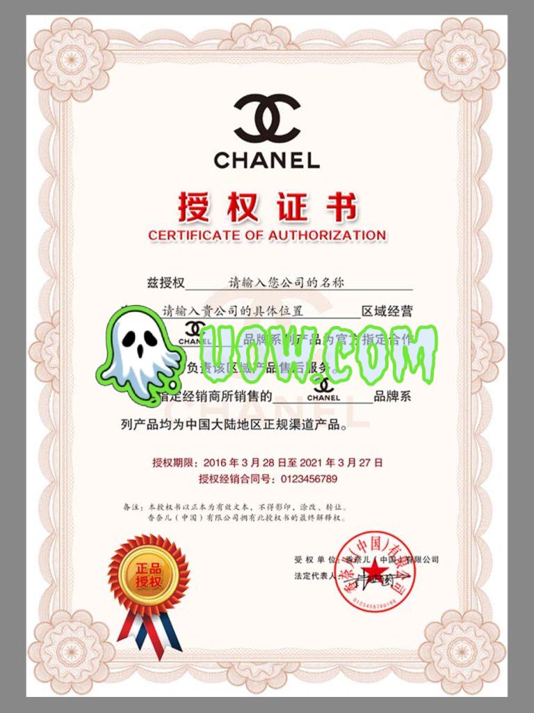香奈儿(Chanel)是一家全球知名的奢侈品公司,成立于1910年,总部位于法国巴黎,以高端时装、香水、化妆品、珠宝和腕表等产品闻名。香奈儿授权证书(Chanel Authorization Certificate)是香奈儿公司颁发给合作伙伴的正式文件,确认其具备代理、销售或推广香奈儿产品和服务的合法权利,旨在保护品牌形象、市场渠道和知识产权。