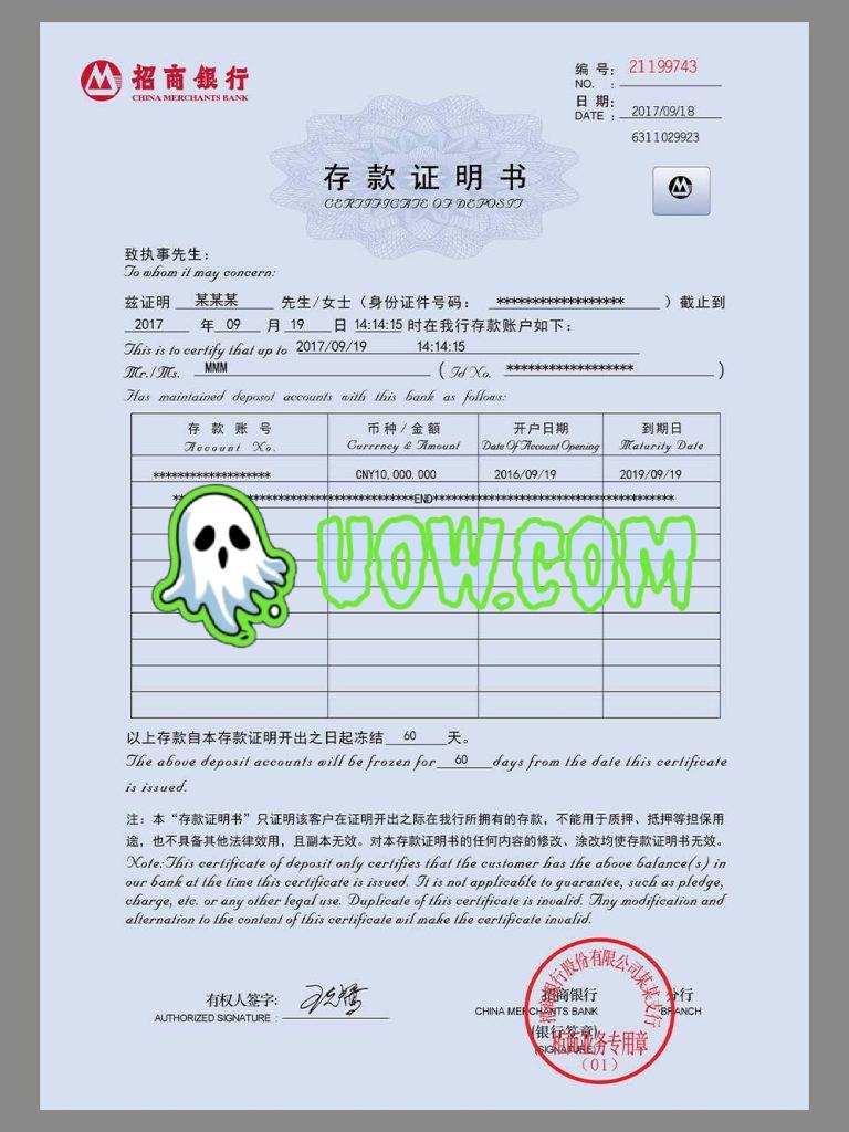 中国招商银行存款证明是由招商银行(CMB)为客户提供的一份证明文件,用于证实该客户在招商银行的个人存款情况,也是客户个人的财力证明文件。