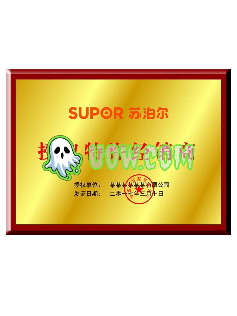 苏泊尔(Zhejiang Supor Co., Ltd.)是中国领先的厨房电器和厨具品牌,成立于1994年,总部位于中国浙江省杭州市。作为中国厨具行业的龙头企业,苏泊尔专注于研发、生产和销售压力锅、电饭煲、电磁炉、炒锅等产品,以创新设计、卓越品质和出色性能闻名。苏泊尔授权证书(SUPOR Authorization Certificate)是苏泊尔公司颁发给合作伙伴的正式文件,授予其在特定领域或地区使用苏泊尔品牌、技术或知识产权的合法权利,旨在推动市场扩展、保护品牌形象和规范合作关系。