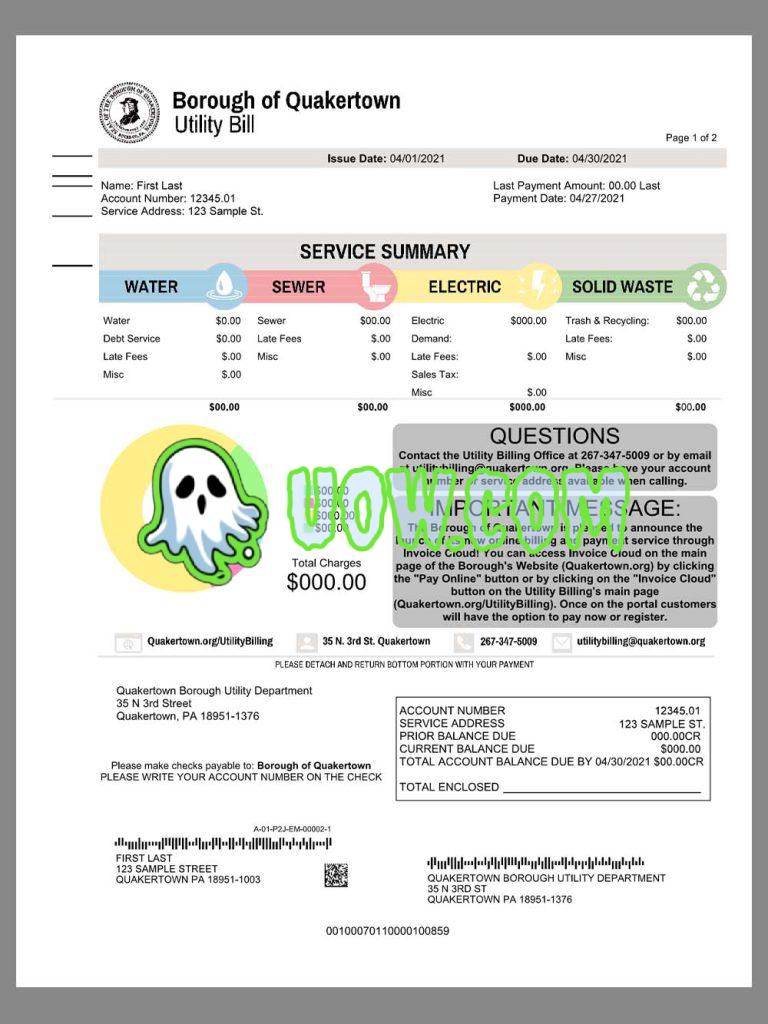 Quakertown自治市(Quakertown Borough)位于美国宾夕法尼亚州巴克斯县(Bucks County),其水电费账单是居民接收的重要市政服务账单,涵盖水务、污水处理和垃圾收集等费用,为居民提供清晰的用量与成本信息。